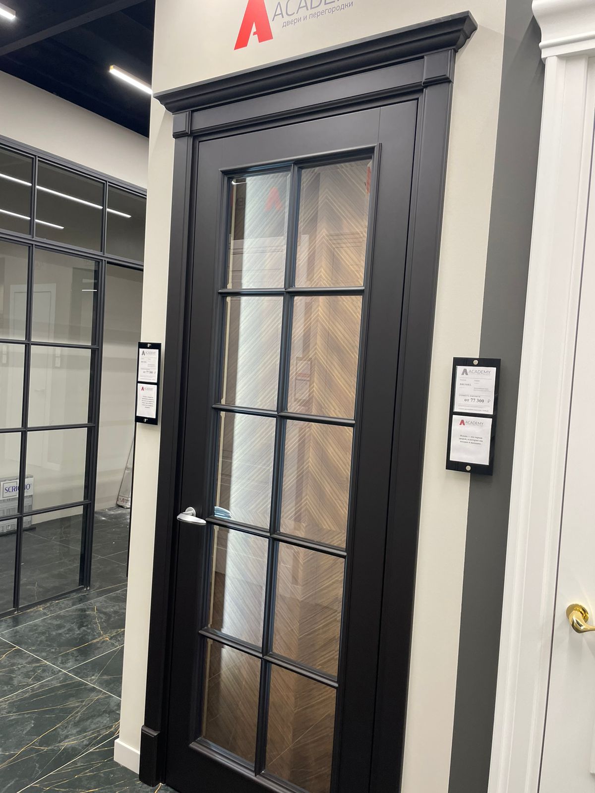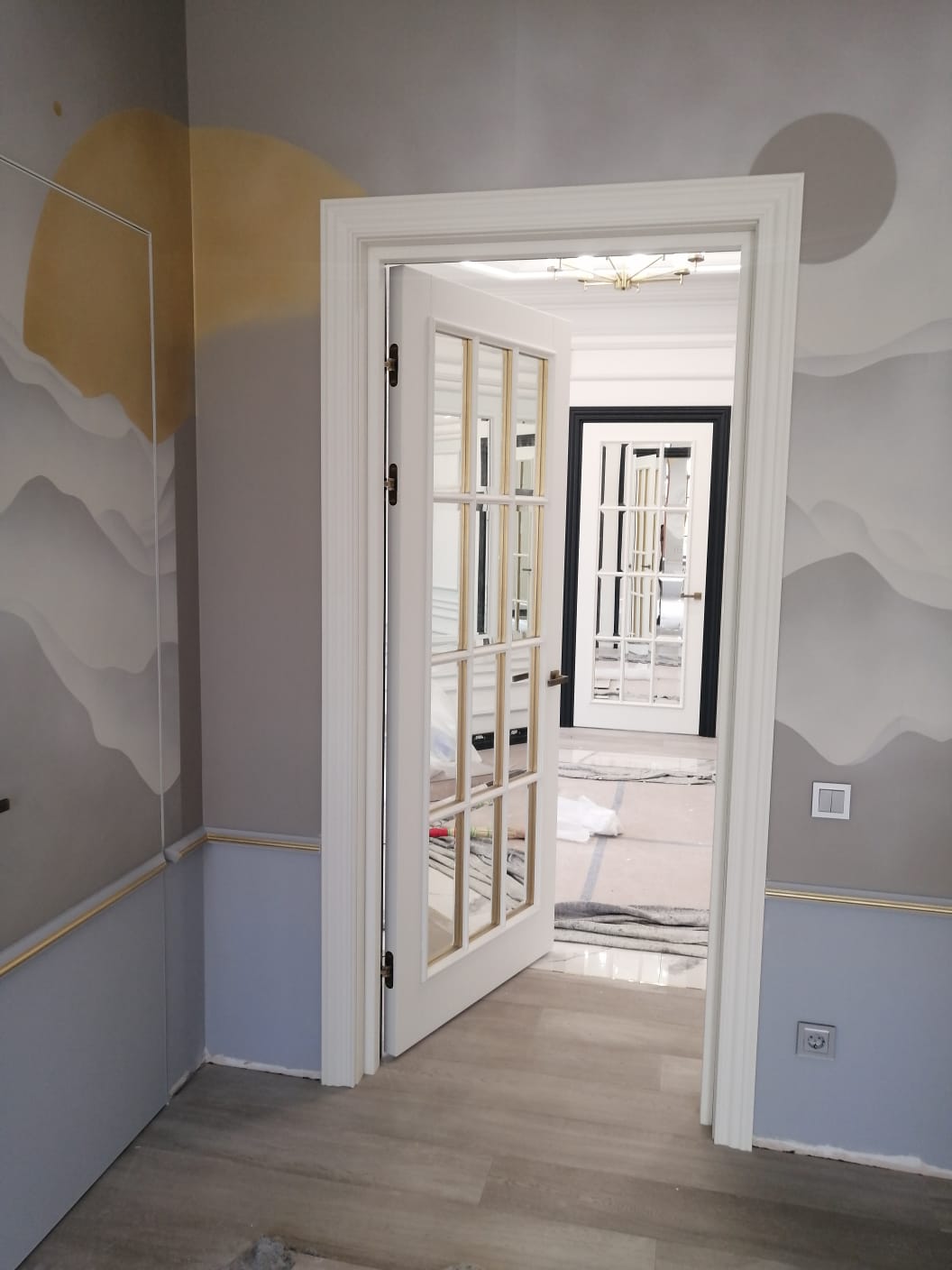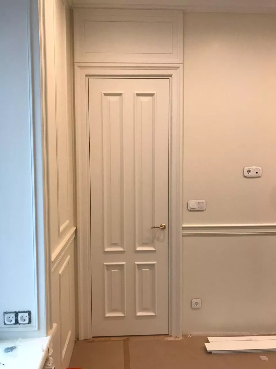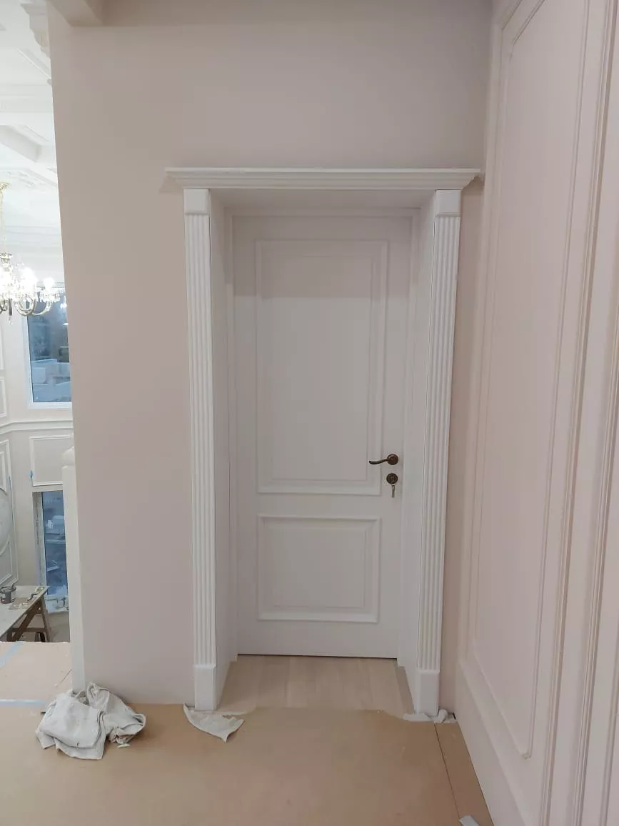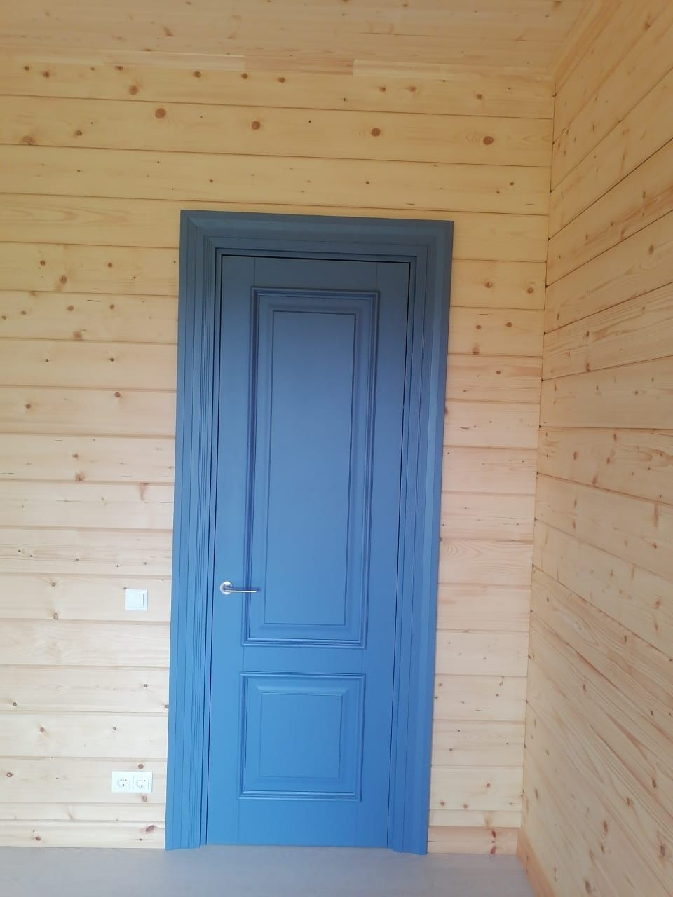 Полотно тамбуратное из инженерного массива (МДФ + ламельный/листельный массив лиственных пород) толщиной 50 мм. с повышенной шумоизоляцией,окра шенное матовыми красками итальянского производства SIRCA с эффектом «soft touch» по шкале RAL с возможностью двусторонней окраски. Объемные филенки, стекла крепятся к полотну с помощью фигурных штапиков (багетов).