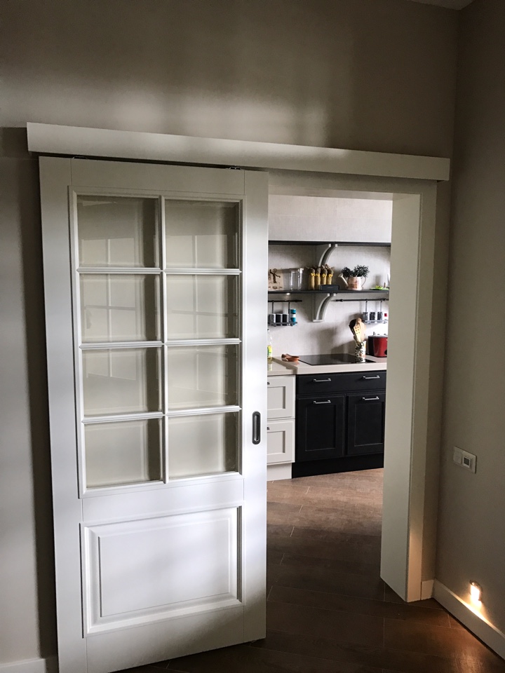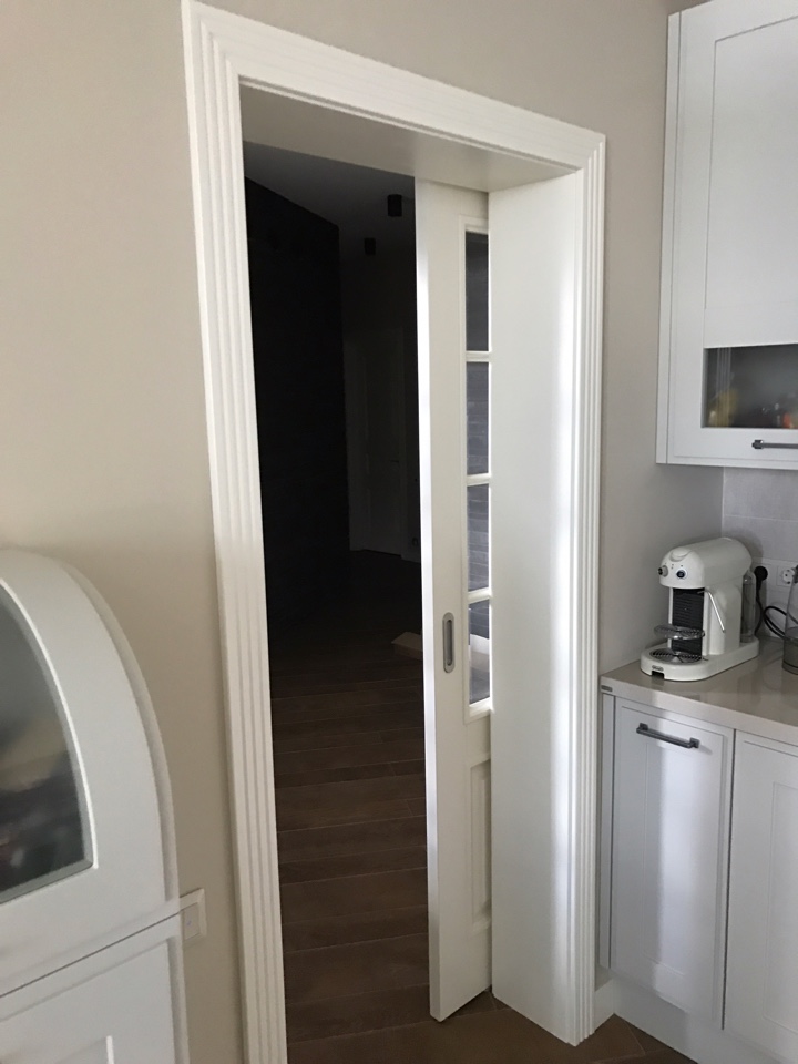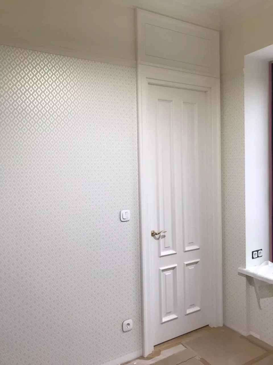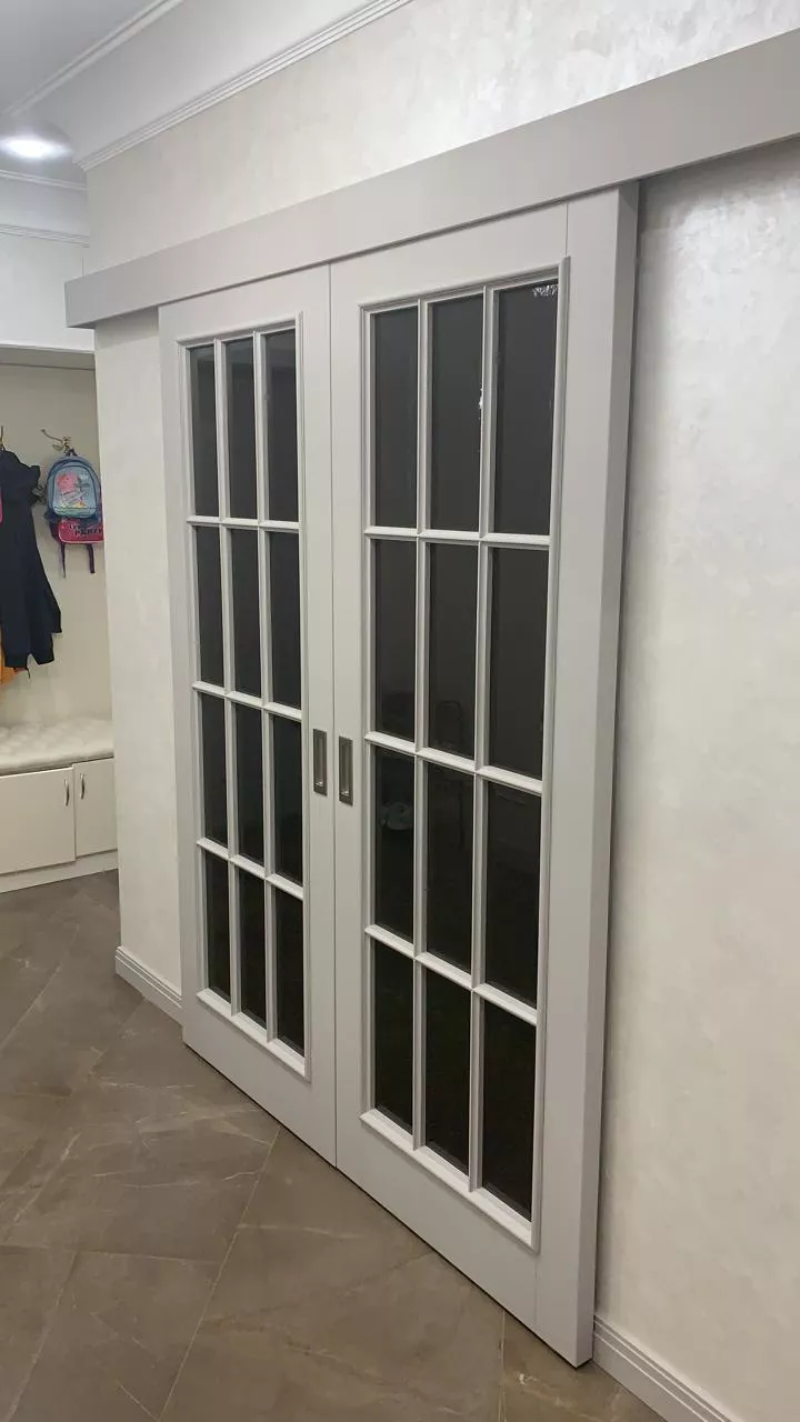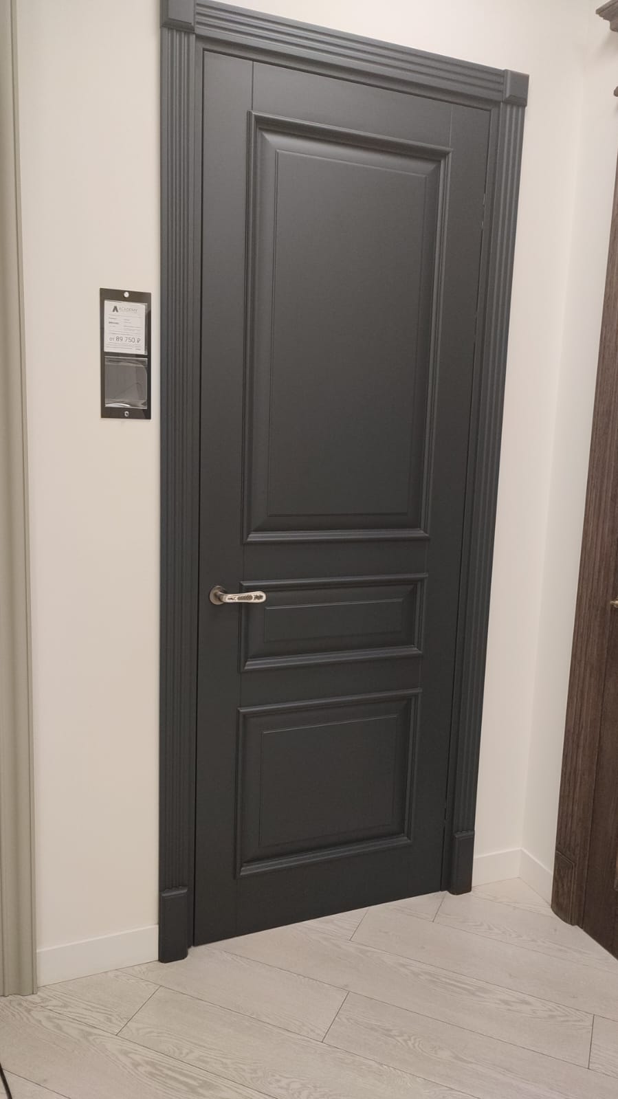 Полотно тамбуратное из инженерного массива (МДФ + ламельный/листельный массив лиственных пород) толщиной 50 мм. с повышенной шумоизоляцией,окра шенное матовыми красками итальянского производства SIRCA с эффектом «soft touch» по шкале RAL с возможностью двусторонней окраски. Объемные филенки, стекла крепятся к полотну с помощью фигурных штапиков (багетов).
