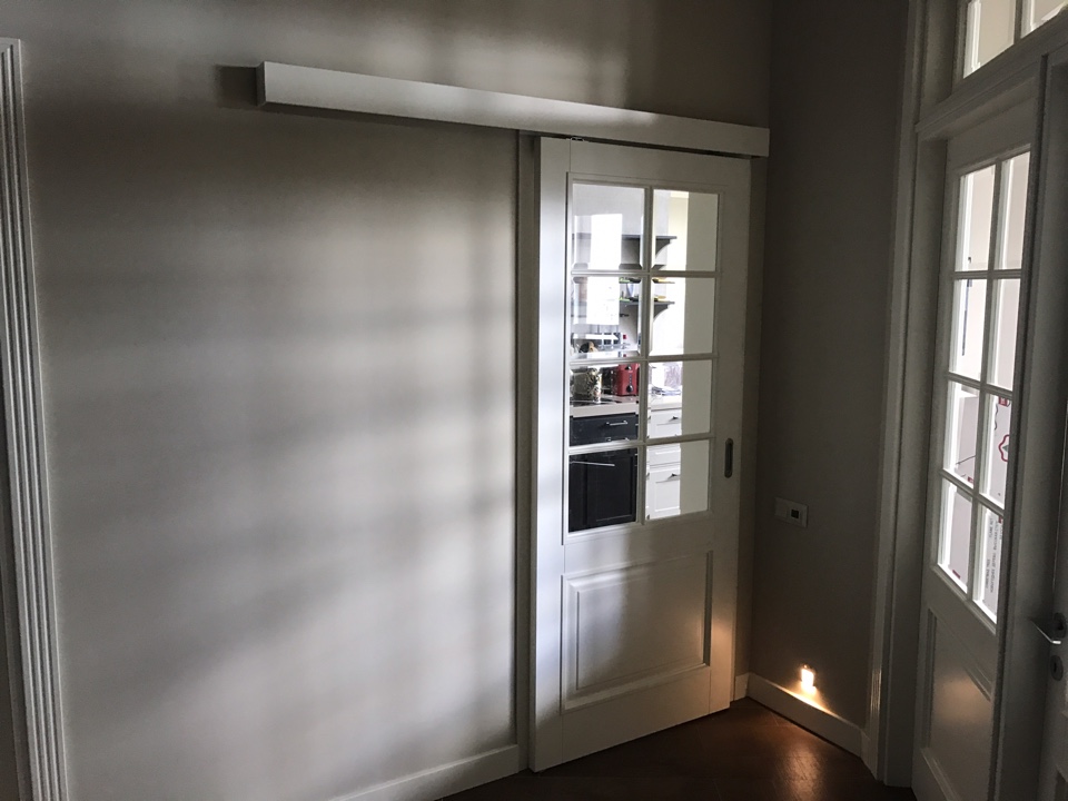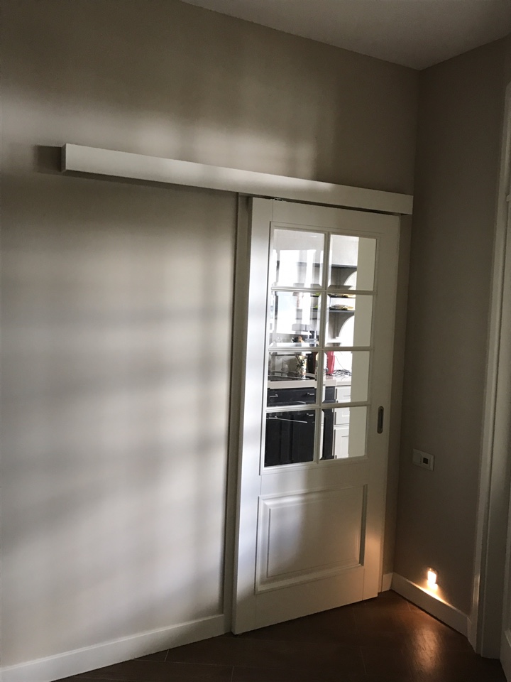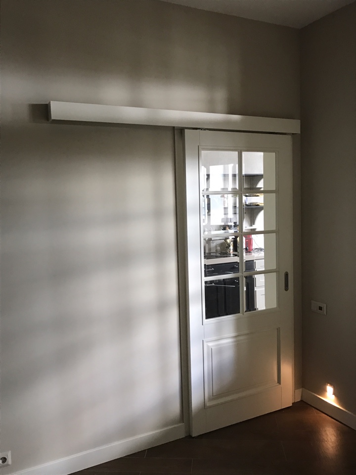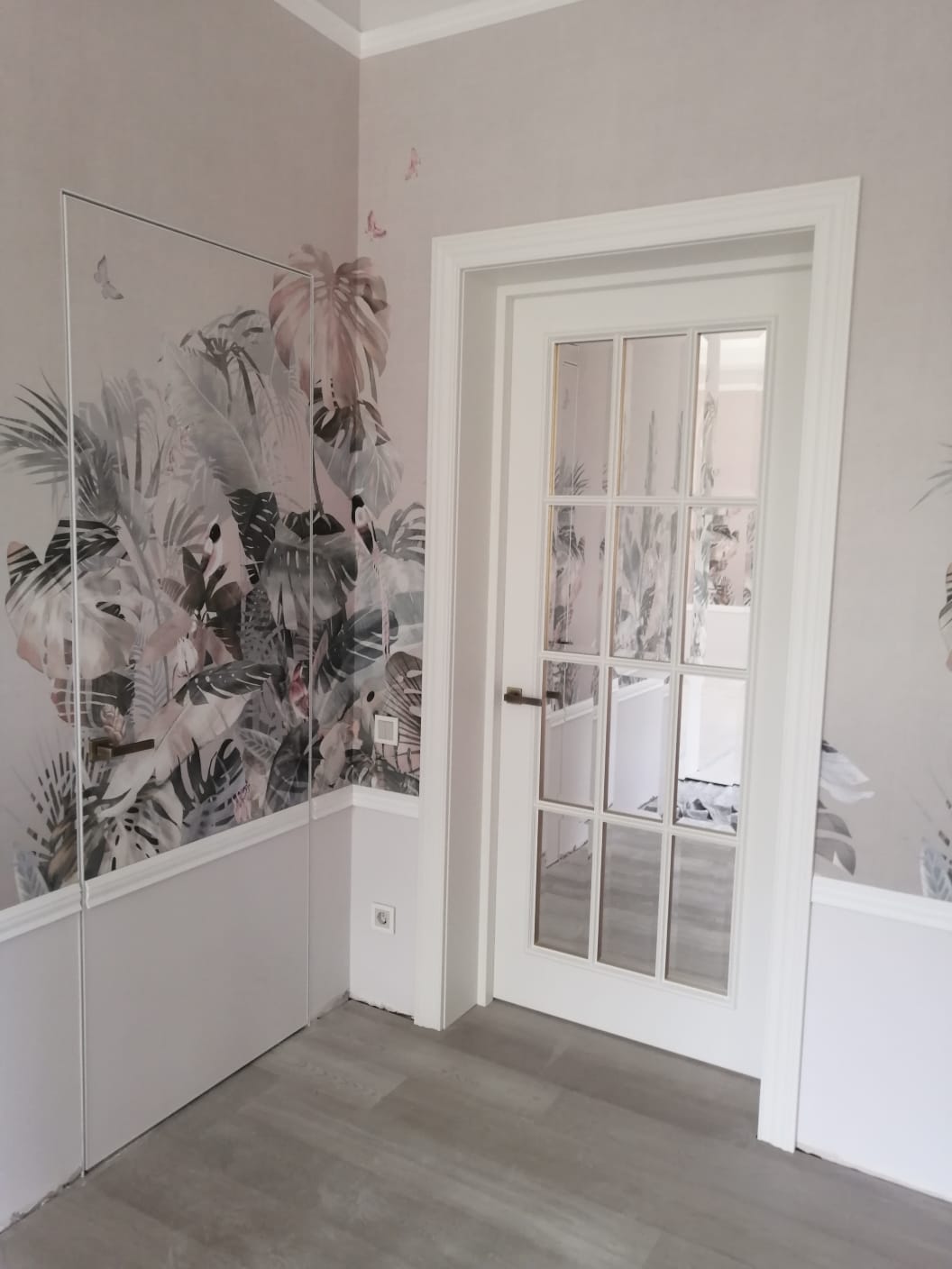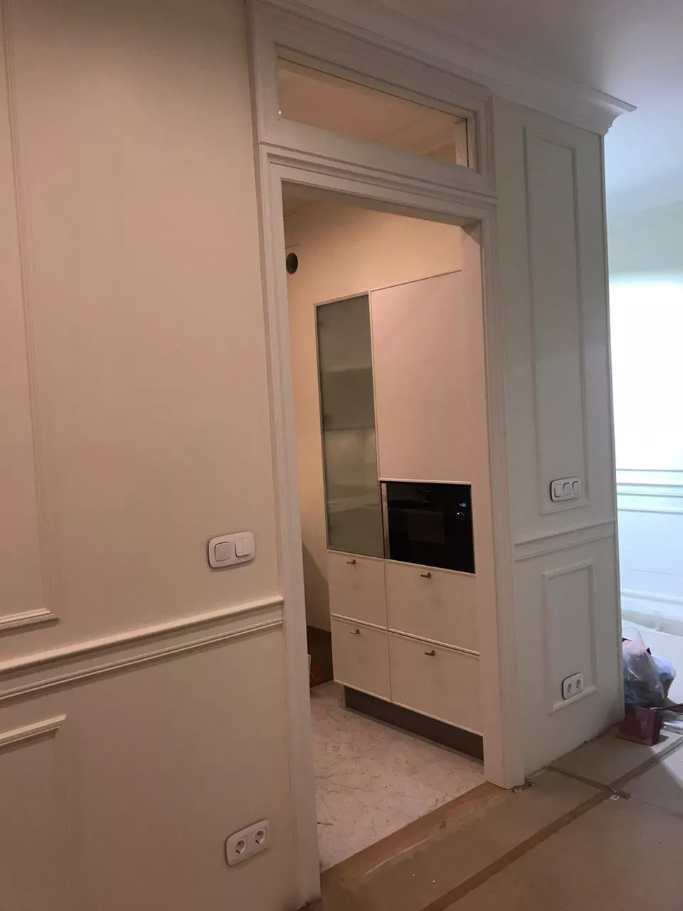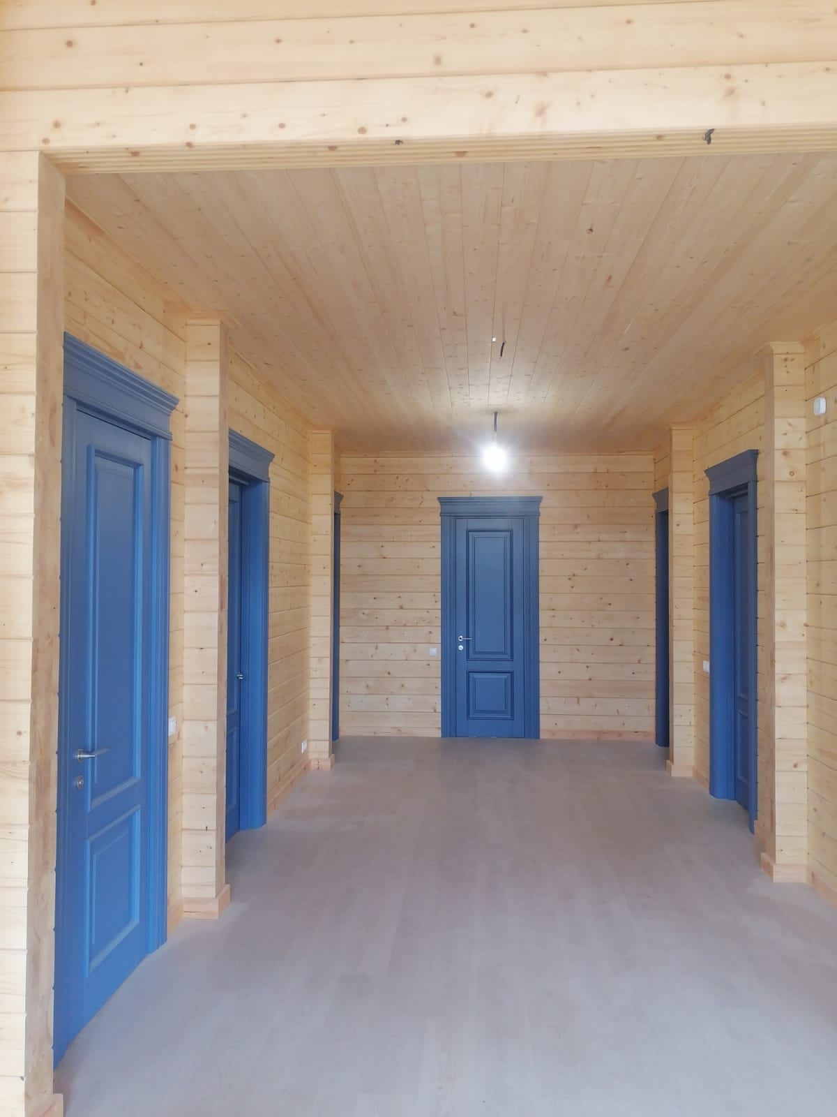 Полотно тамбуратное из инженерного массива (МДФ + ламельный/листельный массив лиственных пород) толщиной 50 мм. с повышенной шумоизоляцией,окра шенное матовыми красками итальянского производства SIRCA с эффектом «soft touch» по шкале RAL с возможностью двусторонней окраски. Объемные филенки, стекла крепятся к полотну с помощью фигурных штапиков (багетов).